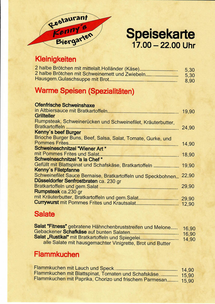 Unsere Abendkarte bietet Ihnen eine Auswahl von typisch deutschen Gerichten wie z.B. Schweinshaxe in Altbiersauce und Bratkartoffeln einem Schnitzel Wiener Art oder einer typischen Düsseldorfer Spezialität, dem Düsseldorfer Senfrostbraten.
